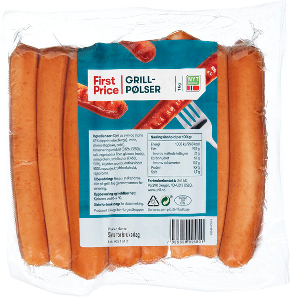 Velger du grillpølsene fra First Price får du sunnere pølser til en billig penge. Kaloriinnholdet og innholdet av mettet fett er noe høyere enn for Go' & Mager og Prior, men pølsene inneholder greit med kjøtt og kommer bra ut av det når det gjelder salt.