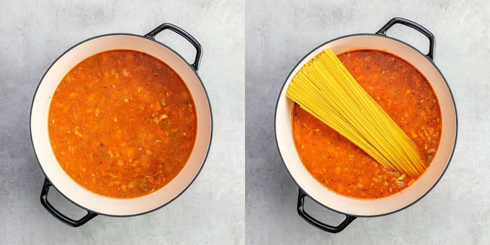 6. Legg til spaghettien. Sørg for å presse den litt ned i sausen, slik at den blir kokt. Følg koketiden som står skrevet på pakningen. Rør om underveis.