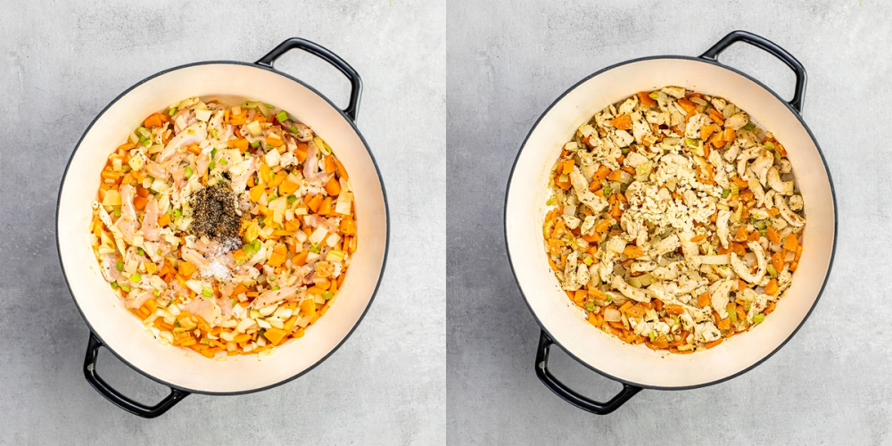 2. Deretter skyver du grønnsakene til side. Skru opp varmen og tilsett strimlet kyllingfilet sammen med tørket oregano, tørket basilikum og chili explosion.