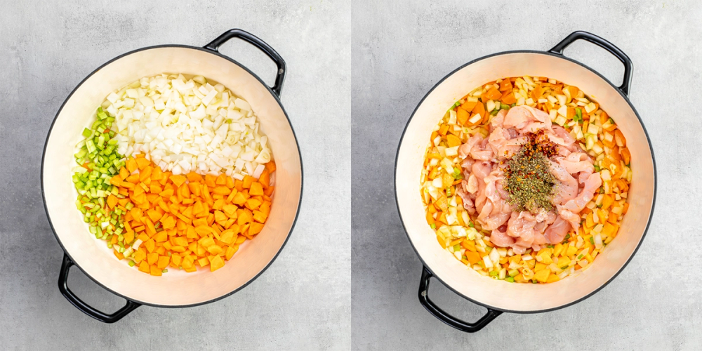 1. Begynn med å ha litt olivenolje i en stor kjele. Fres hakket løk, gulrøtter og stangselleri på middels høy varme til det blir mykt.