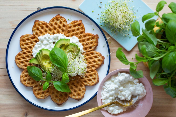 Denne varianten er like god til lunsj som til kvelds. Med mager cottage cheese og avokado får du i tillegg i deg både proteiner og sunt fett. Topp gjerne vaflene med friske spirer og nykvernet pepper for mer smak.