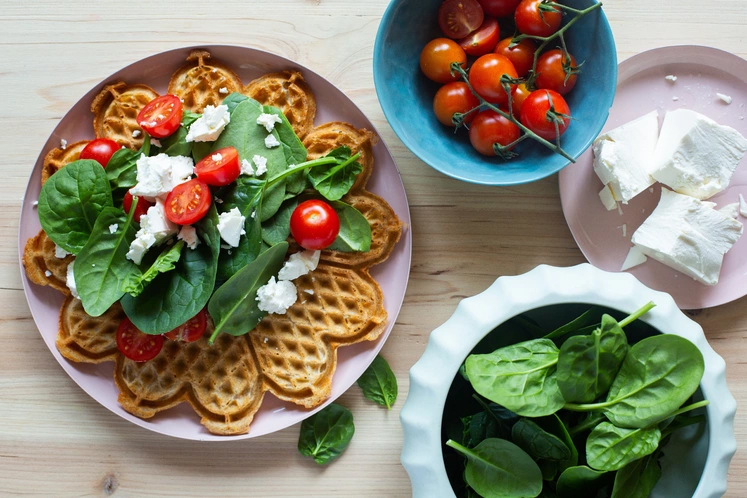 Spinat, ost og tomat er en klassisk kombinasjon som passer overraskende godt på vafler. Legg spinat på en hel vaffelplate, dryss over cherrytomater delt i to og smuldre litt Apetina på toppen så har du en deilig lunsj klar på 1-2-3.