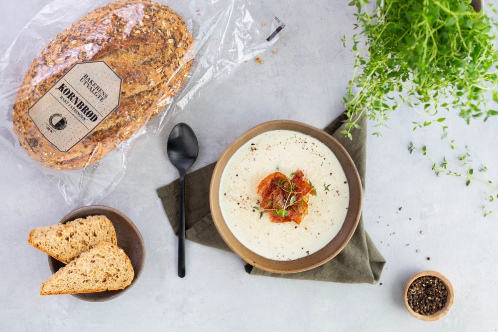 Suppe og brød er en klassisk kombinasjon. Og til denne fløyelsmyke blomkålsuppen passer Bakerens Utvalgte Kornbrød perfekt. Det er et saftig og smaksrikt brød med mye frø og korn på skorpen, noe som gjør at brødet går godt til alle typer supper.