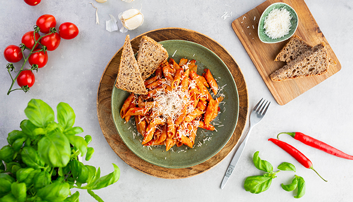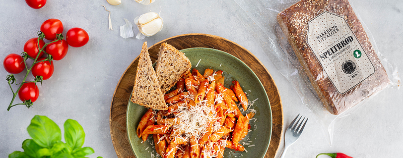 Pasta arrabbiata er en rask og enkel vegetarrett med mye smak. Arrabiata betyr nemlig sint på italiensk og navnet kommer av den fyrrige smaken av chili. Bakerens Utvalgte Speltbrød med sin milde og runde smak passer derfor perfekt til denne hissige pastaretten.
