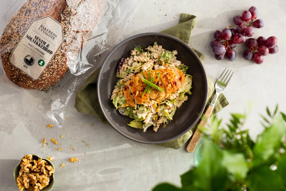 - Ha alt i bollen sammen med pastaen og bland godt sammen. Vend inn salaten rett før servering og topp med hakkede valnøtter. Server med Bakerens Utvalgte Sesam & Solsikke.