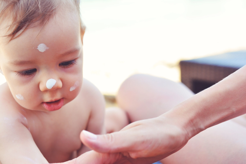 Smør godt med solkrem med høy faktor på hud som ikke er beskyttet av klær. Påfør solkrem hver time og sjekk at solkremen beskytter både mot UVA og UVB, samt at den er vannfast og fotostabil. Pakk med en parasoll eller et soltelt når dere skal på stranden, og husk at barn under ett år ikke bør oppholde seg i direkte sollys.