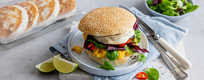 Skreiburger med frisk mangosalat og spicy chilimajones