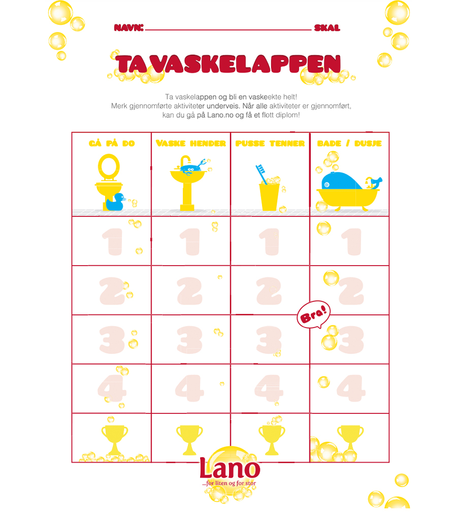 Vil du gi barnet litt ekstra motivasjon kan dere laste ned vaskelappen. Her kan barnet selv krysse av for utførte aktiviteter, enten det er å bade, gå på do, vaske hendene eller pusse tenner. Dette bidrar til å gjøre rutinene til en lek og skaper mestring for barnet.