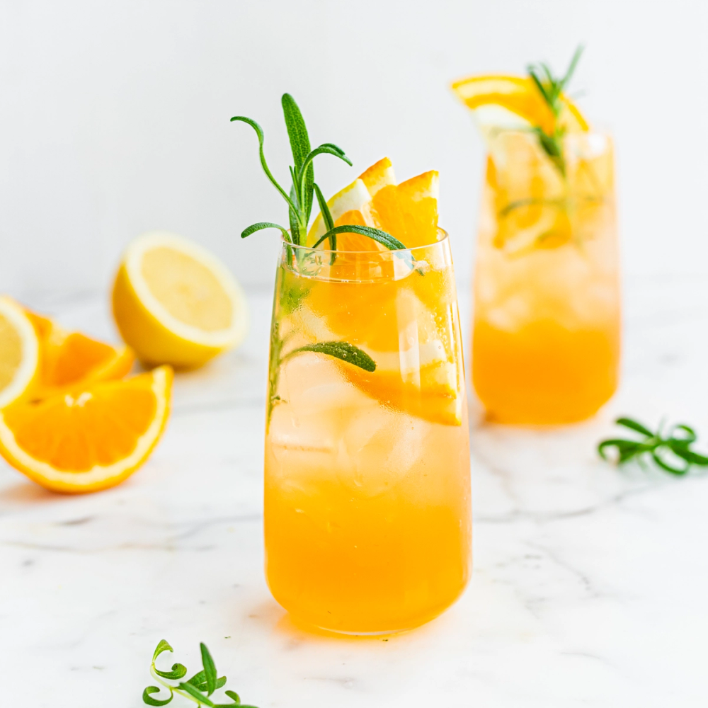 - Pynt hvert glass med en skiver av appelsin, lime og en rosmarinkvist på kanten av glasset.