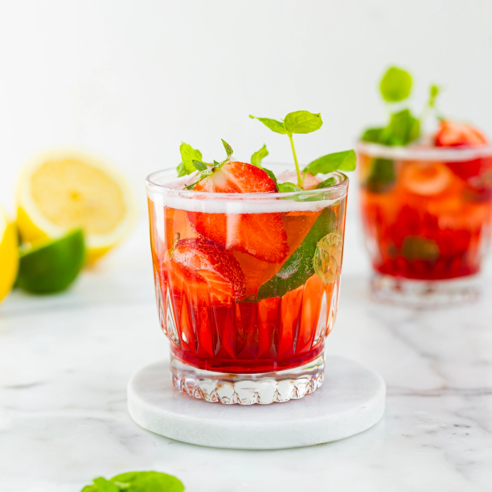 - Pynt med en skive lime, et par mynteblader og friske jordbær.