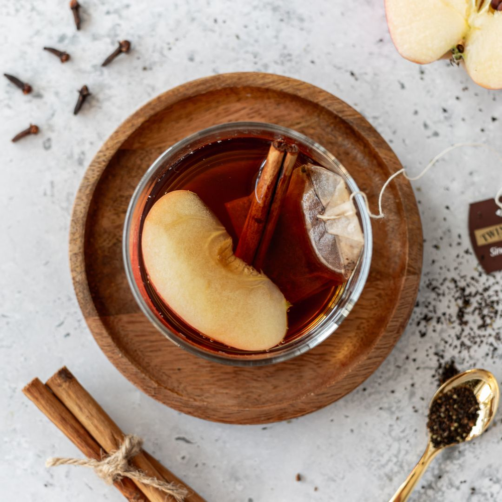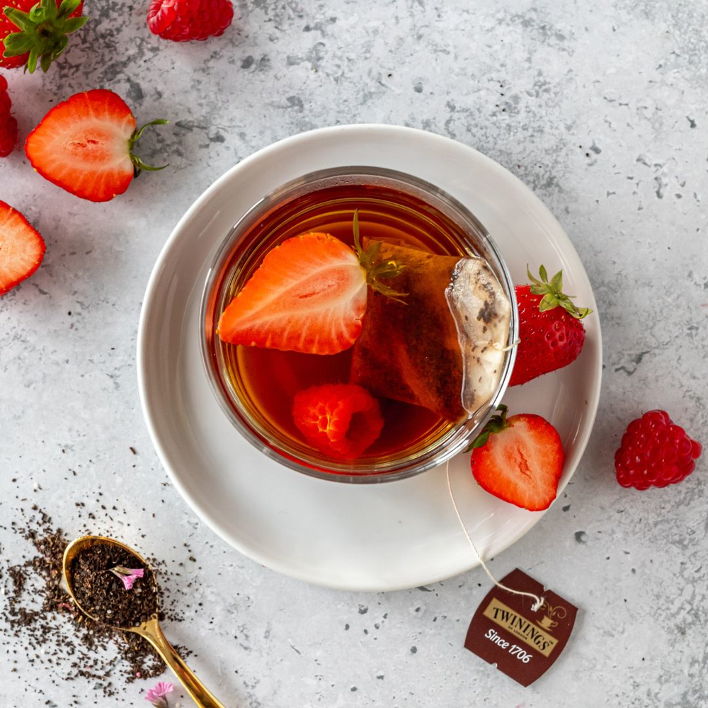 Frukt-te basert på sort te trekkes i tre til fem minutter og nytes med eller uten melk.