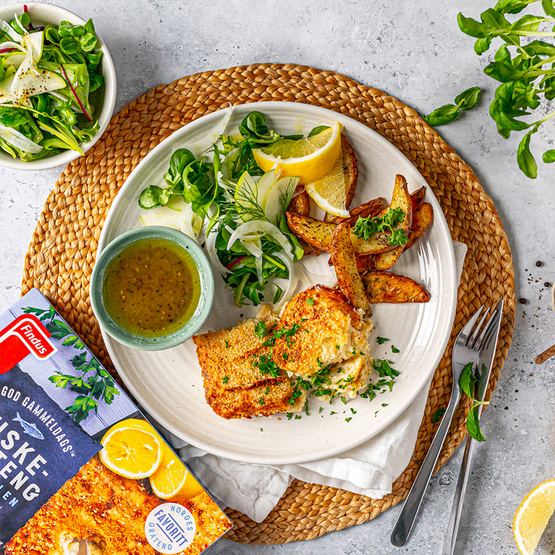 Om du ønsker en litt mer utradisjonell vri på fiskegratengen kan du servere en frisk råkostsalat med sprø potetbåter, toppet med en syrlig vinaigrette!