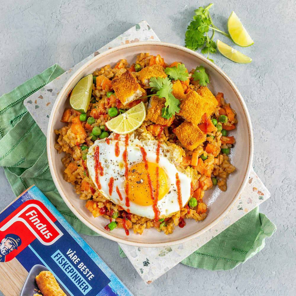 - Server fiskepinnene med stekt ris og topp med speilegg (valgfritt), koriander, sriracha og lime. Vel bekomme!