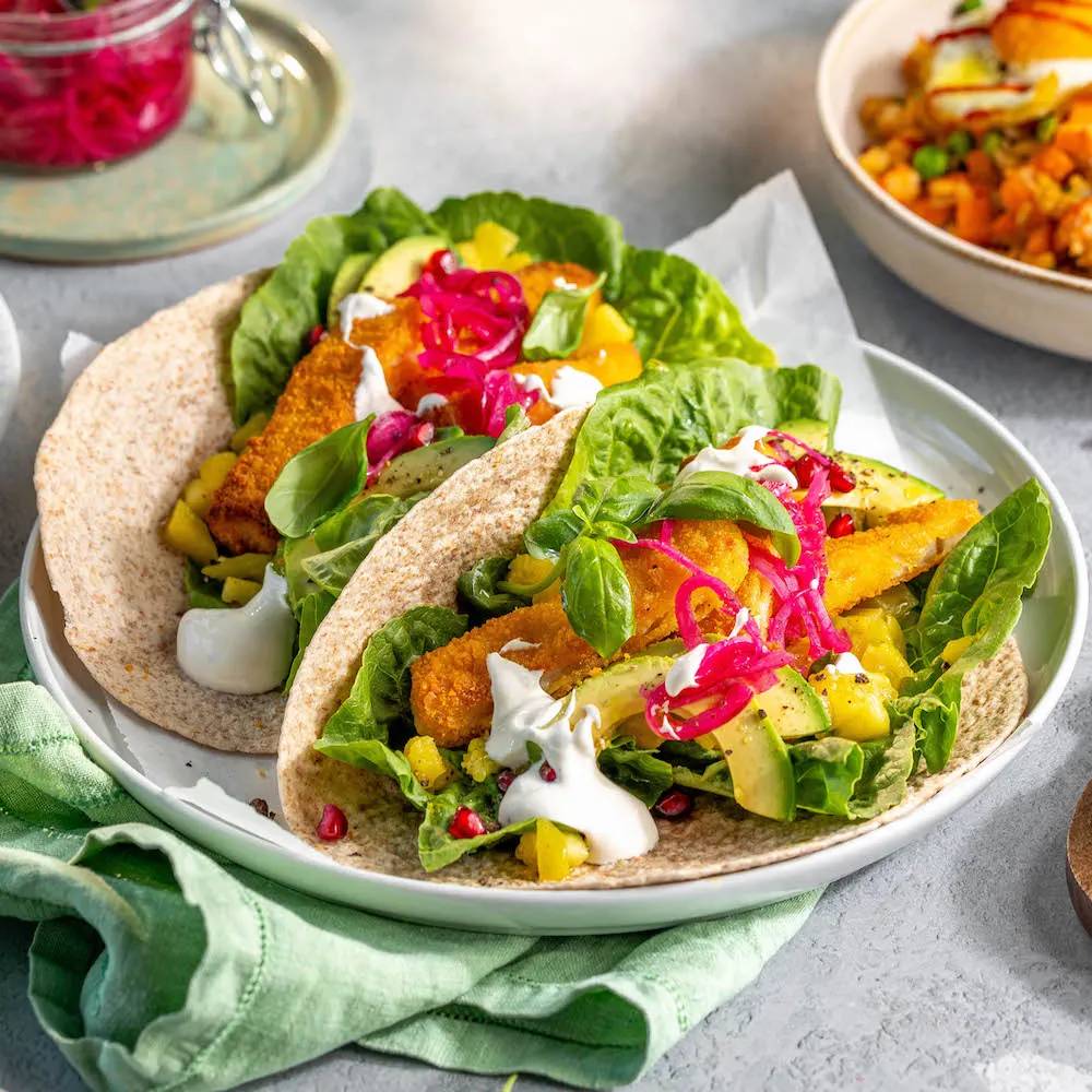 - Fyll tortillaene med hjertesalat, basilikum, mango, avokado og syltet rødløk. Topp nystekte fiskepinner, urtedressing og granateplekjerner hvis du har. Rull sammen og nyt!