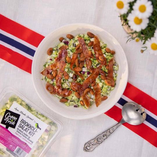 Grønn & Frisk Brokkolisalat Kit setter et godt grunnlag for smakfulle salater. Legger du til stekt spekeskinke, rista mandler og en honningdressing, får du en salat som både er veldig enkelt og skikkelig god.