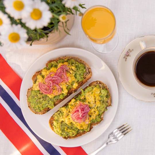 En god frokost starter ofte med et godt brød. Avokadotoast med eggerøre og hurtigsyltet rødløk består av mange gode ingredienser som også er gode hver for seg.