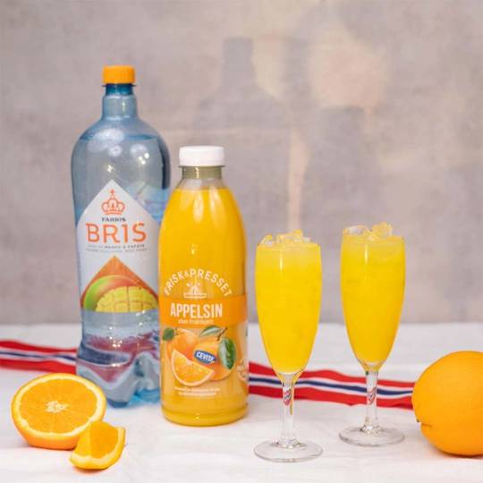 - Fyll halvparten av glasset med appelsinjuice, og resterende halvparten med Farris Bris.
