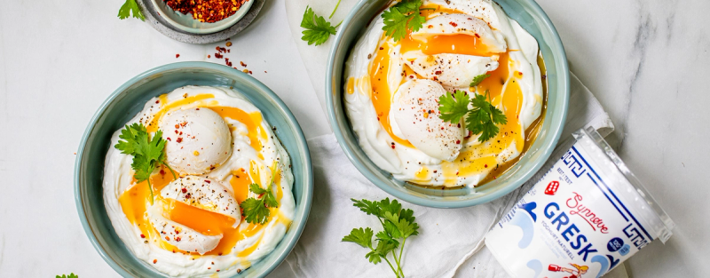 Gresk yoghurt har blitt et populært valg til frokost og lunsj, og det er ikke så rart - den er både anvendelig, næringsrik og smakfull. Synnøve helt ekte Gresk Yoghurt er produsert i Hellas, og har en fyldig konsistens, inneholder lite fett og er rik på proteiner. Den inneholder også mer protein enn vanlig norsk yoghurt. Her får du to oppskrifter som viser hvordan du kan bruke gresk yoghurt på ulike måter; en søt og en salt variant.