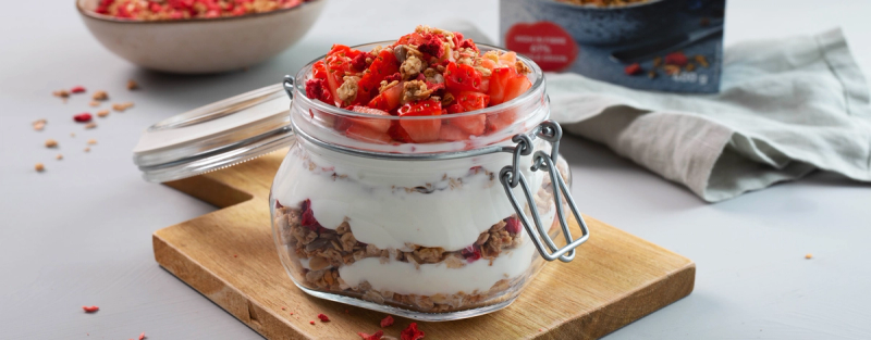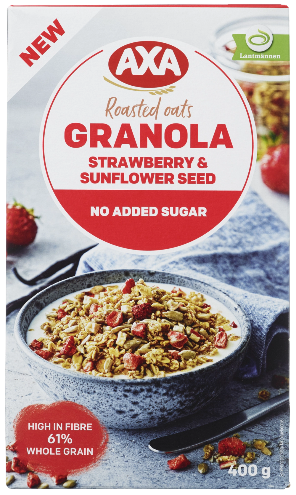 Ofte ser man at mange frokostblandinger og granola kan være rene sukkerbomber. Granolaen med jordbær og solsikkekjerner fra AXA er imidlertid helt uten tilsatt sukker, og med et høyt innhold av fullkorn og fiber.