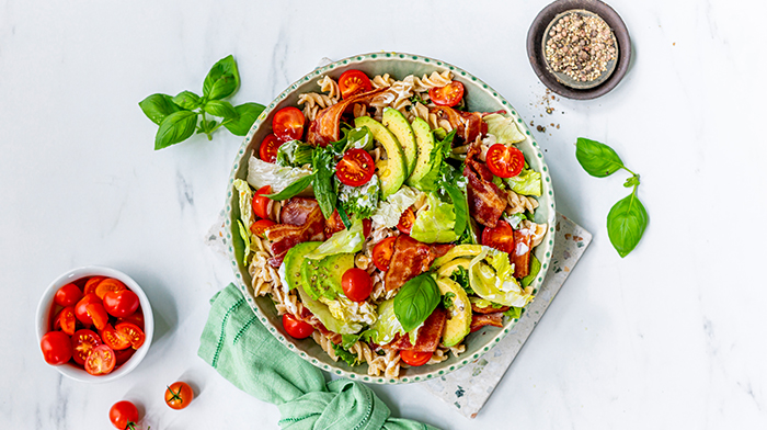 BLT-sandwichen er en klassiker de fleste kjenner til, men hvorfor ikke prøve en ny vri i form av en pastasalat? Knasende sprøtt bacon, søte tomater, kremet avokado og frisk salat er en herlig kombinasjon.