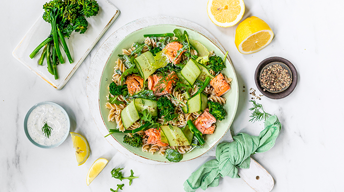 - Vend salat, pasta, brokkolini, agurk og rødløk forsiktig sammen i en bolle. Legg på biter av stekt laks og server dilldressingen ved siden av.