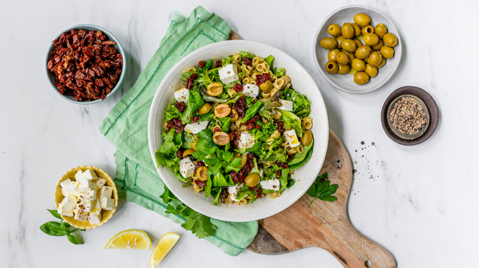 Smaker fra Middelhavet passer godt om sommeren. Med ingredienser som soltørket tomat, oliven og en frisk pestodressing, får du en skikkelig god og mettende pastasalat.