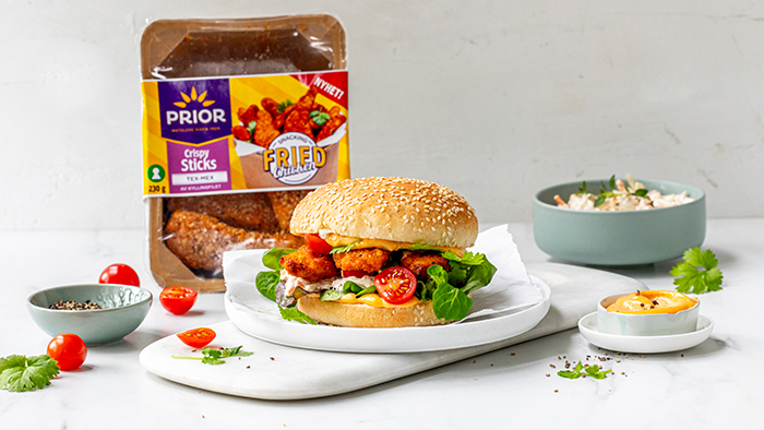 - Legg varme PRIOR Crispy Sticks sammen med coleslaw, salat, sylteagurk og chilimajones på burgerbrød.