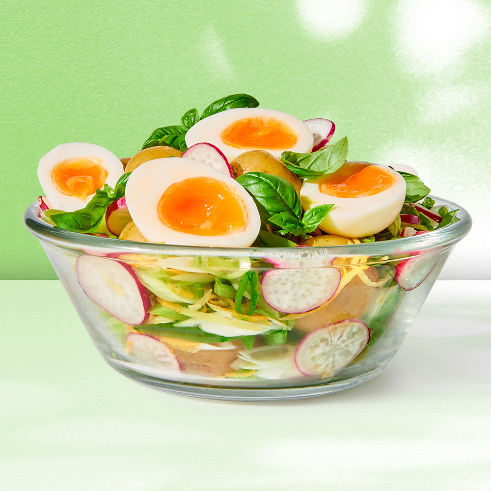 - Legg i poteter, vårløk, sukkererter, reddiker, chilipulver og en god klype salt og pepper, og vend det sammen.