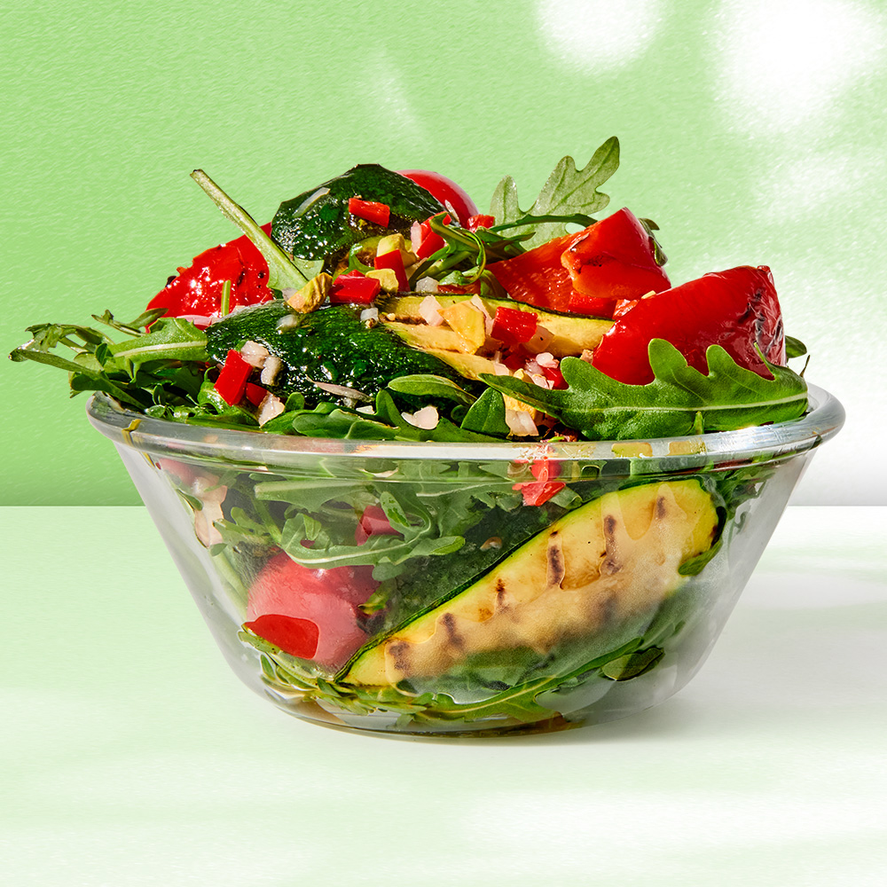 - Vend sammen ruccula, de grillede grønnsakene og dressingen, og topp med grovhakkede pistasjkjerner. Server straks.