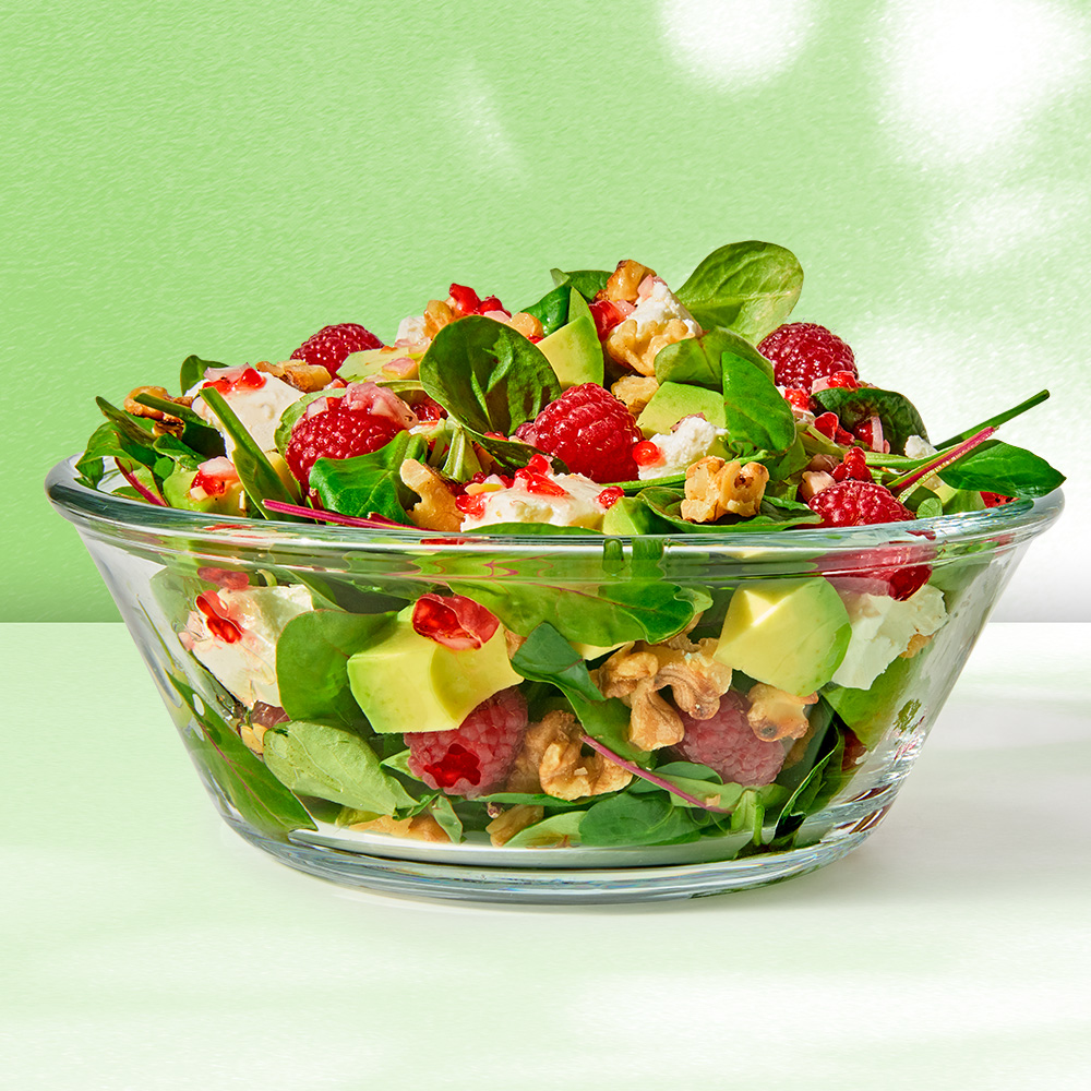 - Legg salatbladene i en stor bolle sammen med 2 dl av bringebærene, avokadoen skåret i terninger og chèvren revet opp i grove biter.