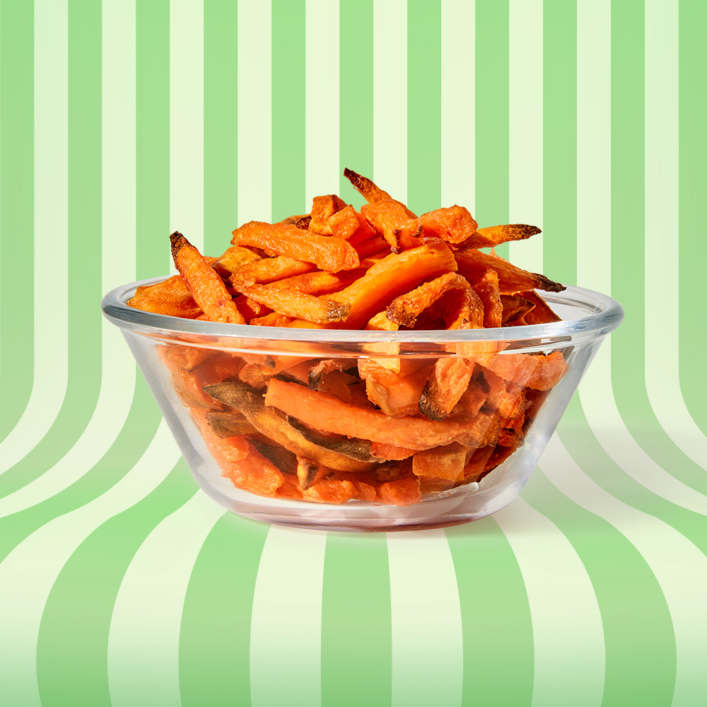 - Skrubb søtpotetene og skjær dem i 1 cm tykke skiver, deretter i staver. Vend dem inn med olje og salt, og spre dem utover en bakepaprikledd stekeplate.