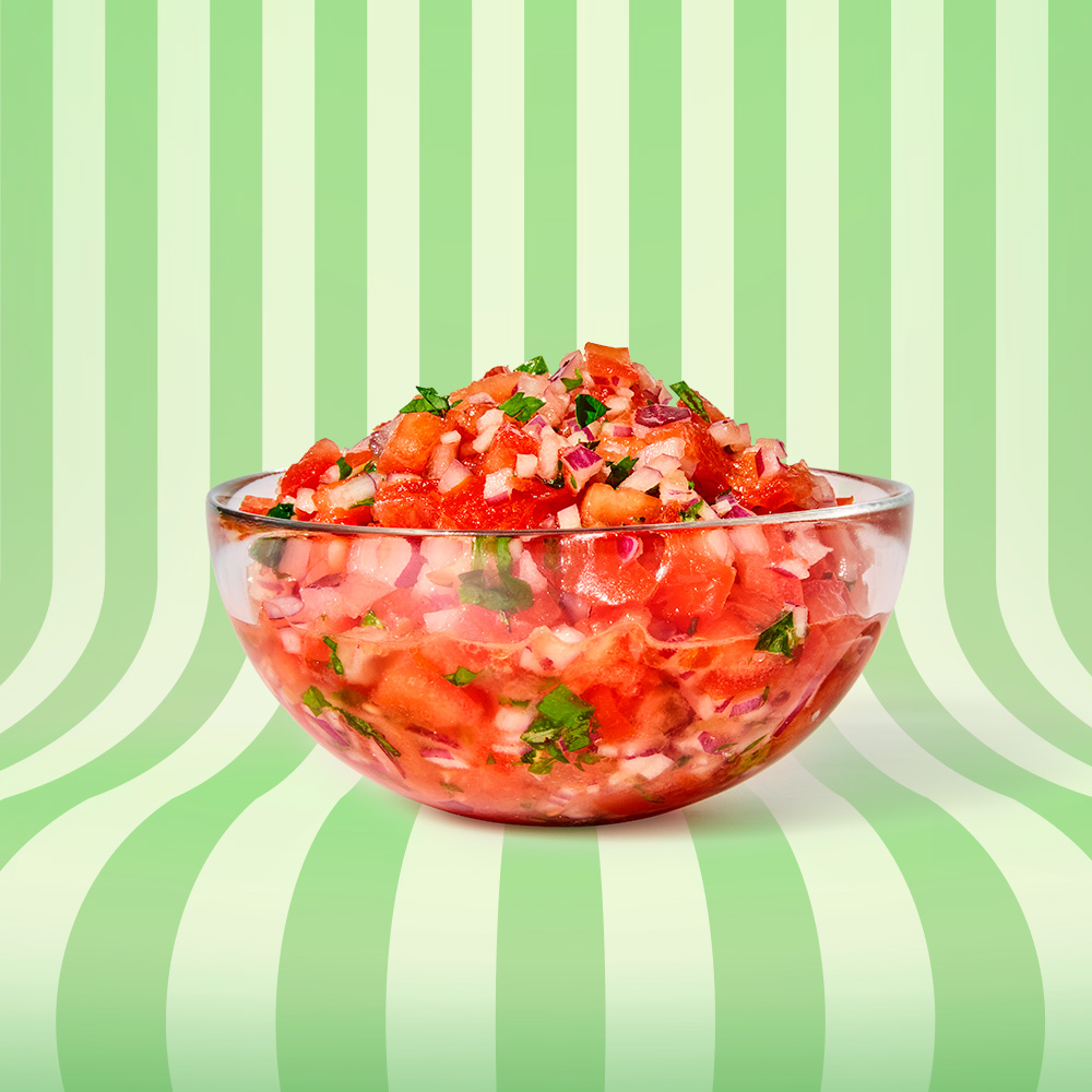 Finhakk tomat, rødløk og urter. Rør inn olivenolje og smak til med salt og pepper.