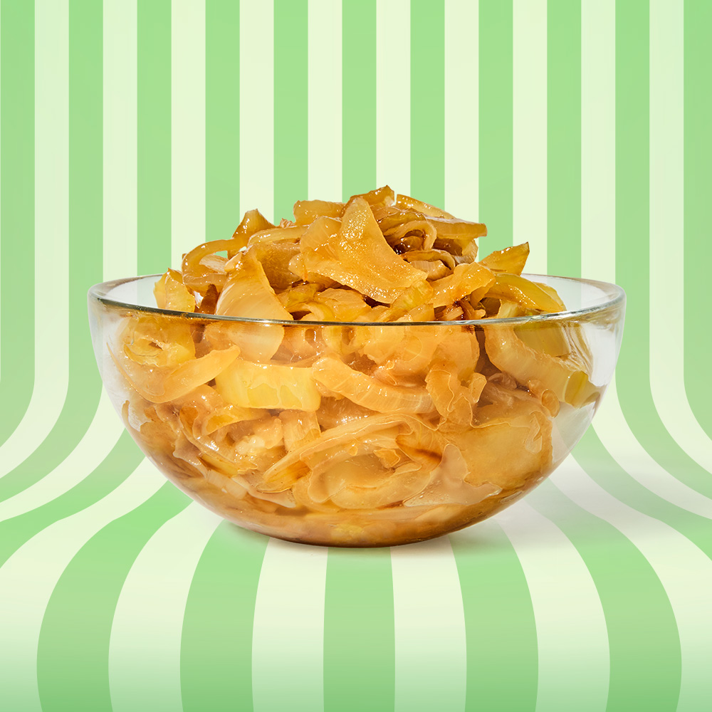 - Stek løken først på høy temperatur, til den begynner å karamellisere, skru varmen ned til middels og la den steke videre til den er gyllenbrun. Smak til med litt flaksalt og eddik.