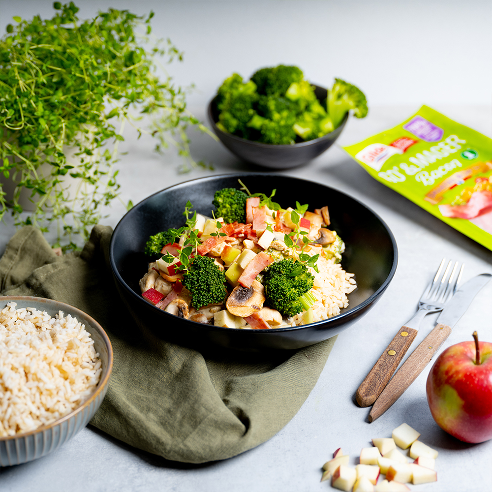 - Kutt champignon i skiver, finhakk løk og hvitløk, og kutt bacon, brokkoli og eple i biter.