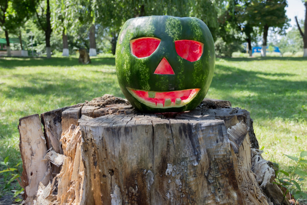 Selv om vannmelonen er grønn, ser den ordentlig stilig ut med fjes og lys. Vil du nærmere oransje kan du bruke en cantaloupe eller honningmelon på samme vis. Frys ned innmaten og bruk den til grufull slush eller smoothie.