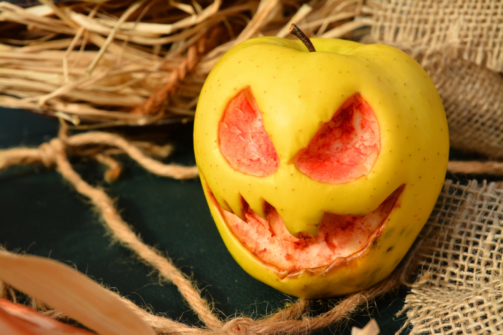 Lager du fjes på eplet noen timer før gjestene ankommer, vil fruktkjøttet skifte farge før festlighetene starter. Bruk rød konditorfarge som blod hvis du vil ha dem ekstra skumle.
