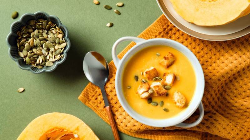 Her er oppskriften på gresskarsuppe med sjallotløk og hvitløk.