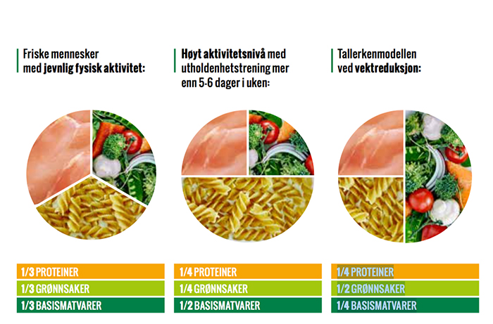 Det finnes ulike varianter av tallerkenmodellen: En for «normalbefolkningen», en for deg som trener mye og en for deg som ønsker å gå ned i vekt. Tallerkenmodellen innebærer at du alltid skal dele innholdet på tallerkenen din inn i tre hoveddeler: