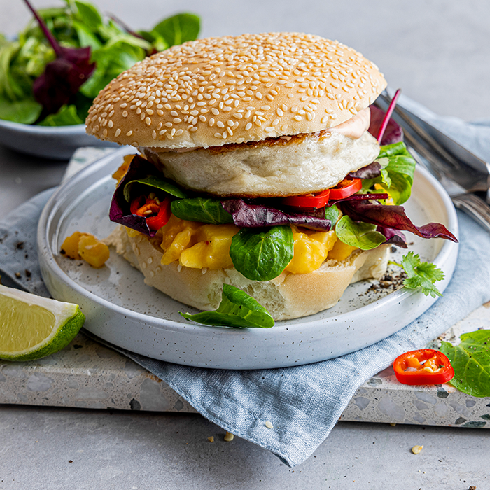 3. Skreiburger med frisk mangosalsa og spicy chilimajones
