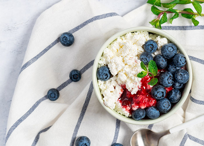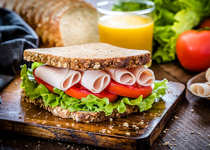 - Grovt brød eller knekkebrød med proteinrikt pålegg av fisk, fugl, kjøtt, egg eller ost og skummet melk + litt grønt