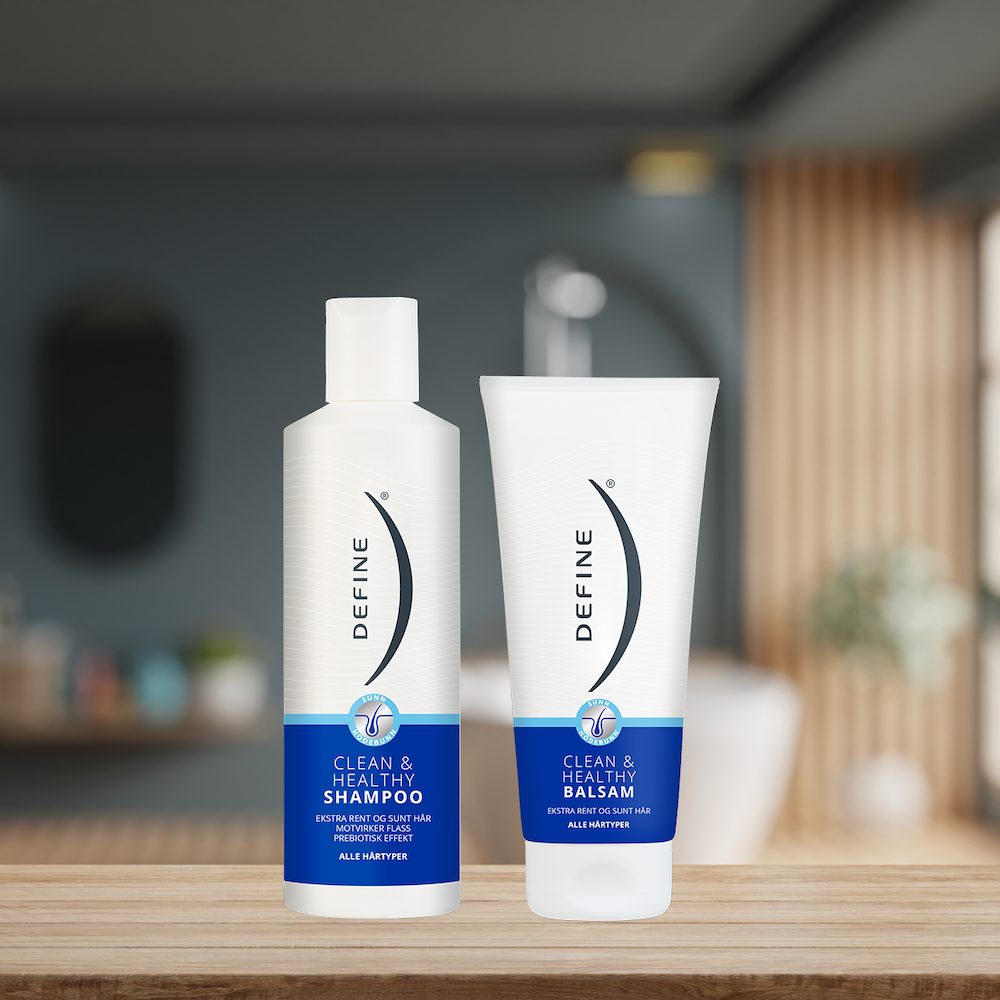 Define Clean & Healthy består av sjampo og balsam som hjelper til med å opprettholde et sunt hår og en sunn hodebunn hos både kvinner og menn. De kan gi opptil 68 prosent flassreduksjon og redusere sensitivitet i hodebunnen med 32 prosent. Produktene renser i dybden, lindrer irritert hodebunn, har prebiotisk effekt og har en frisk og god duft.