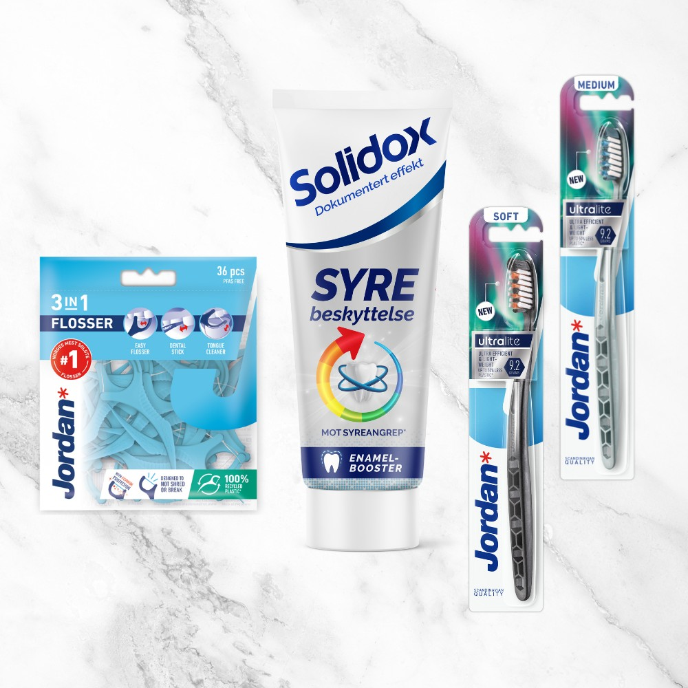 Fra Jordan kommer også Jordan ID 3-in-1 Flosser med fluor, som fjerner plakk mellom tennene, stimulerer tannkjøttet og fjerner bakterier på tungen. Fluor bidrar til å holde tennene friske og sterke, og kan bidra til å forebygge karies.