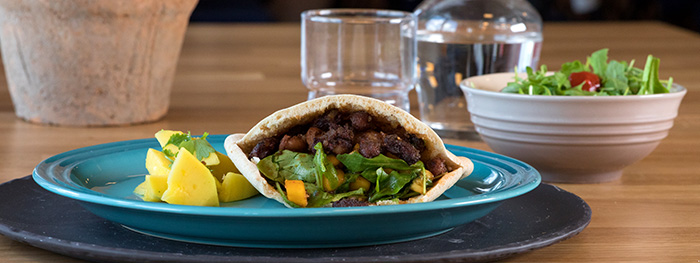 Asiatisk mango- og ruccolasalat i pita med sprøstekte bønner.