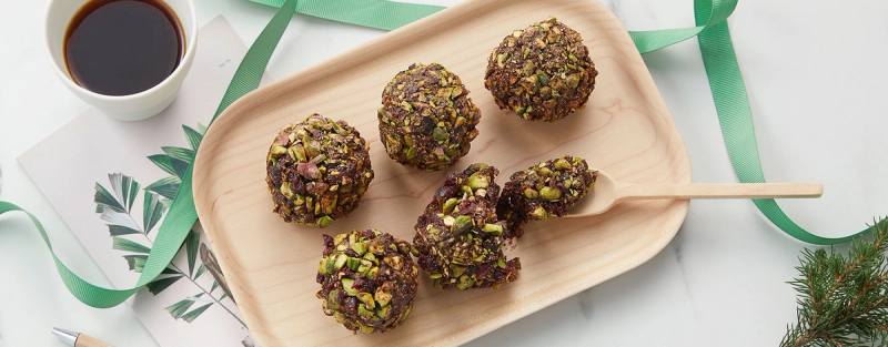 Daddelkonfekt med mørk sjokolade og hakket pistasj