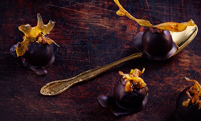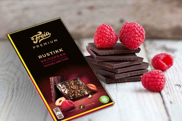 Frukt og sjokolade er alltid en god match. Har du ikke lyst eller tid til å lage selv, er Freia Premium rustikk bringebær og karamelliserte hasselnøtter også et godt alternativ.