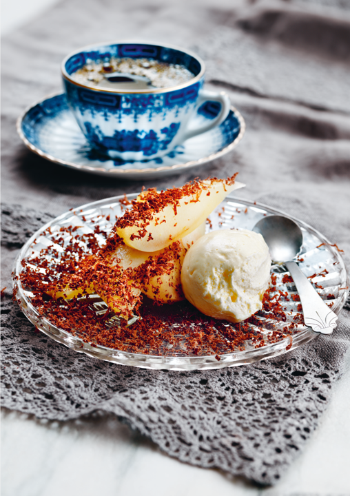 Du koker opp vann, sukker og sitronsaft. Skrell pærene, del dem i fire og fjern kjernehuset. Legg pærene i den kokende laken, la det koke i 5 minutter eller til pærene begynner å bli myke. Fordel pærebåtene på fire dype tallerkener, ta med litt lake som "saus". Riv sjokoladen direkte over pærene med den fineste delen av rivjernet. Servere pærene med is ved siden av.