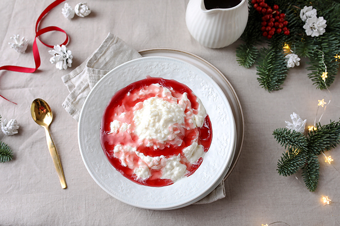Riskrem er enkelt å lage, og har du dårlig tid kan du også kjøpe ferdiglaget First Price risgrøt. Sausen lager du raskt og enkelt med rød husholdningssaft, vann og potetmel.