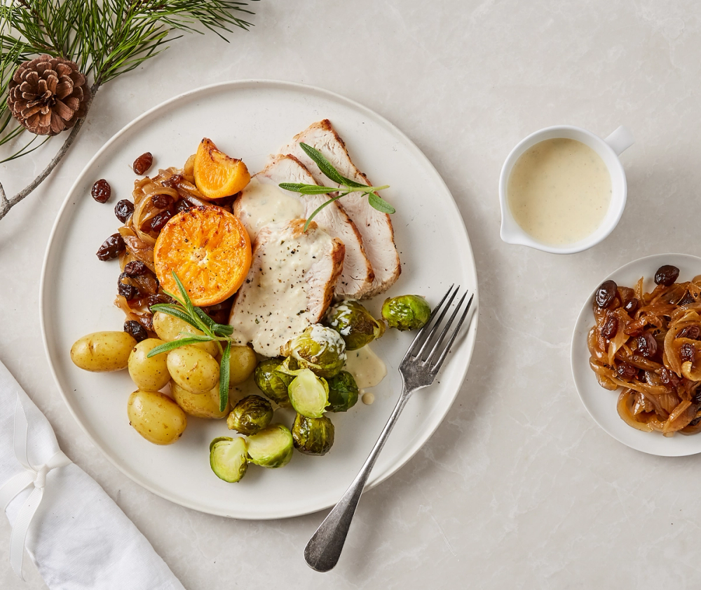2. Kalkunfilet med karamellisert løk, rosenkål og kremet oreganosaus