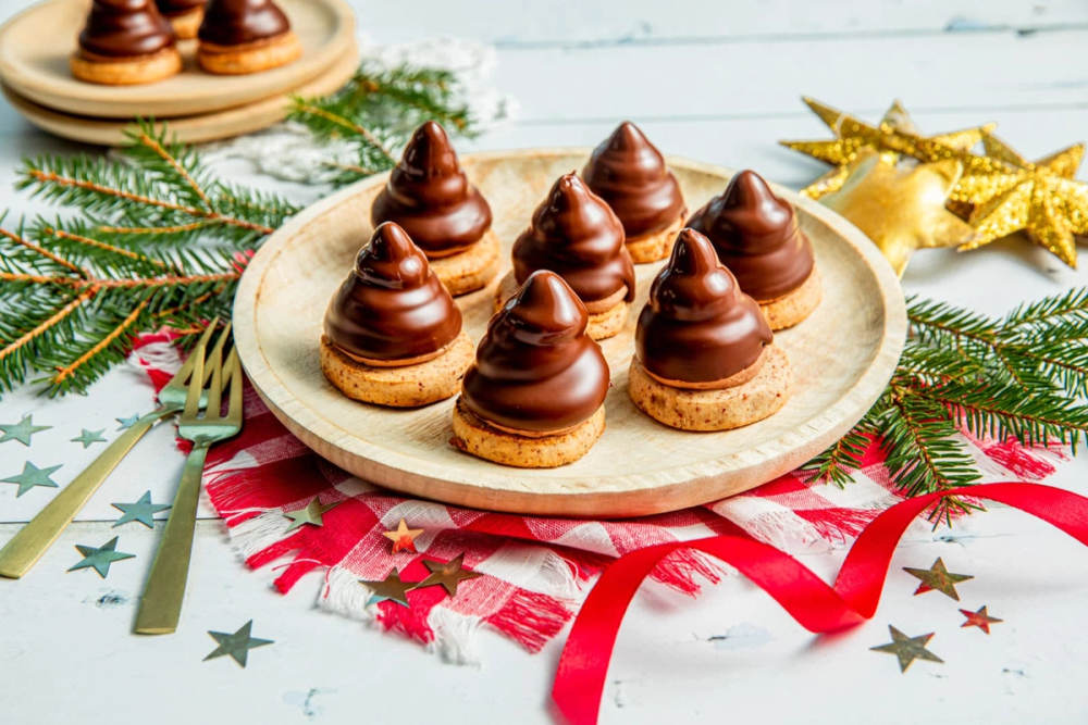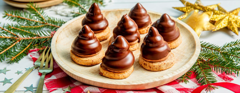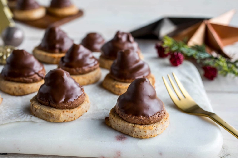 - Ha sjokoladekremen over i en sprøytepose, enten med rundt hull eller en vid stjernetyll, og sprøyt på topper av sjokoladekrem på de avkjølte bunnene. Sett småkakene i frysen i 1 time.