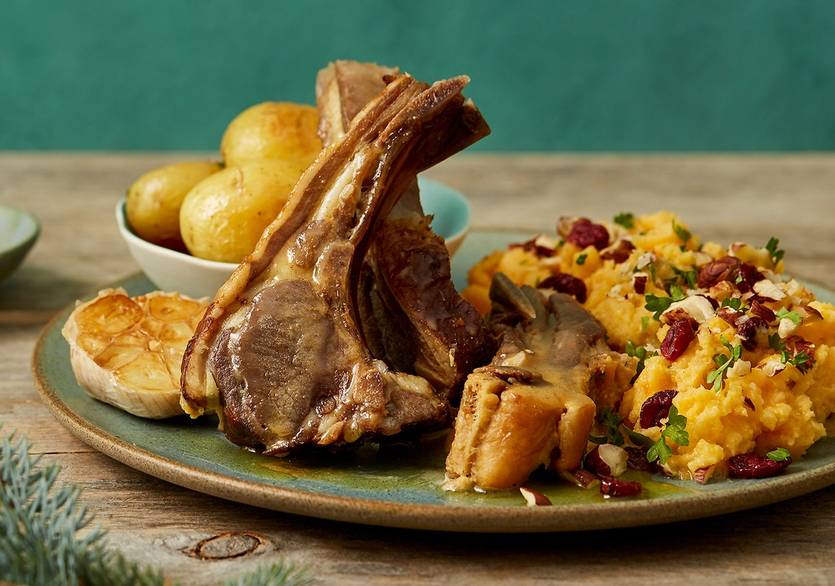 De vanligste tilbehørene er mandelpoteter, kålrotstappe og vossakorv – ofte med rød- eller surkål og tyttebærsyltetøy ved siden av.